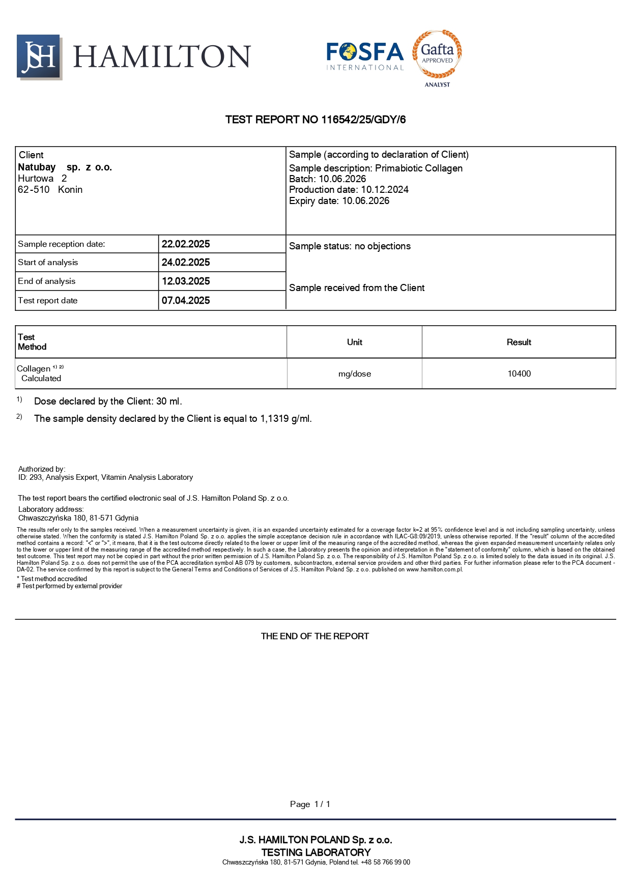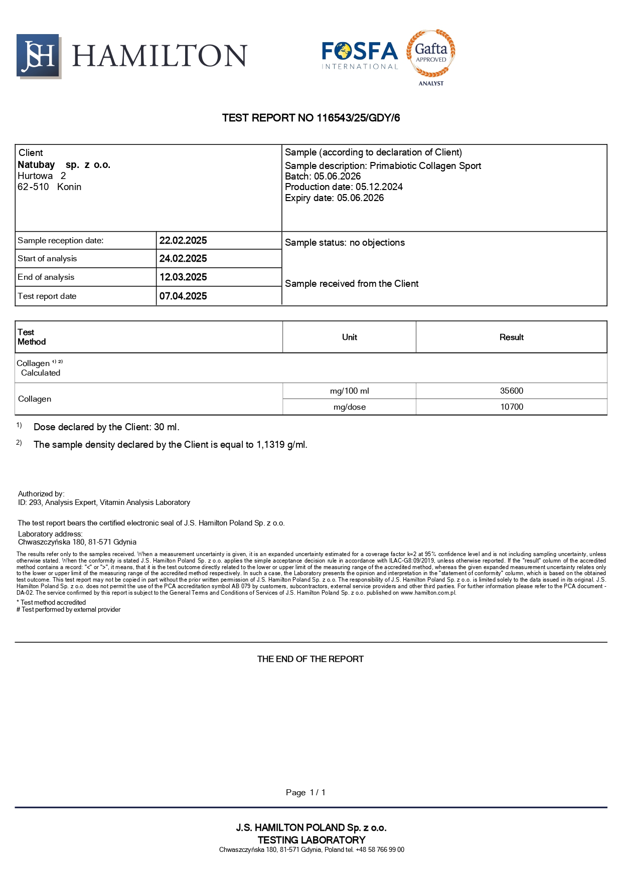Primabiotic Collagen Sport: tested for collagen content